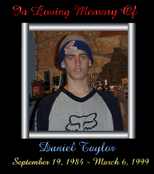 Daniel attended 9th grade at the Buena Regional High School. He was an avid Motorcross rider and was most recently training for competition. He played for several years for the Buena Little League Baseball. He also enjoyed playing for the West Atlantic County Youth League Softball and Basketball teams. Daniel is survived by his parents, John and Linda Taylor of Dorothy, his brother, Nicholas of Dorothy, and his sister Patricia of Dorothy, his grandparents, John Taylor of Northfield and Jeanne Best of Northfield, his aunts Eileen Cummins of Linwood, Kathleen Taylor of Connecticut, and Maureen Taylor of Ohio, his uncles, Rich and his wife Mitra Best of California and Fred Lemkhul of Ohio and many cousins. Mass of Christian Burial will be held at 10:30 AM on Wednesday, March 10, 1999 at St. Vincent DePaul RC Church, Route #50, Mays Landing. Burial will be at the Holy Cross Cemetery, Mays Landing. Relatives and friends may call from 7pm until 9pm on Tuesday evening at the Adams-Perfect Funeral Home 1650 New Road, Northfield. Memorial contributions may be made to the American Motorcycle Heritage Foundation, 13515 Yarmouth Drive, Pickerington, OH 43147. |